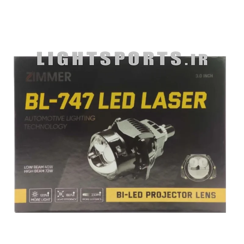 لنز اسپرت بای ال ای دی BI LED 747 دو کنتاکت دارای تیغه برقی ال ای دی و عدسی مجزا برای نور بالای قوی تر و لیزری قابل نصب روی چراغ های متوسط و بزرگ نور پایین دارای خط کات Zدارای دو نور بالای مجزانور بالای لیزری نقطه زن جاده ای نور بالای وایده آل شهری ال ای دی پر قدرت با پرتاب نور 10 برابری نسبت به چراغ فابریکی و نیورسال و قابل نصب روی انواع خودرو